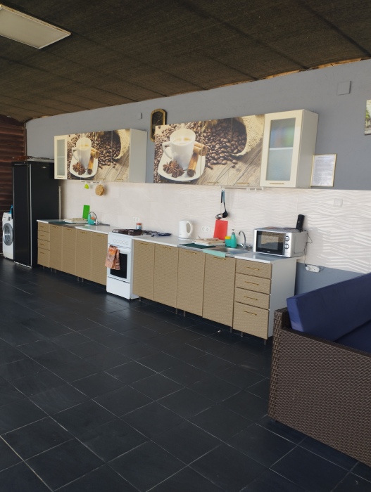 На территории, к услугам гостей, благоустроенный двор, просторная летняя кухня, более 50 кв.м. со всем необходимым для самостоятельного приготовления пищи, место для мангала, детская площадка, места для отдыха на свежем воздухе.