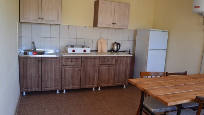 Двухкомнатная квартира на 5 мест (кровати: одна двухспальная в отдельной комнате и три односпальные в отдельной комнате), санузел (горячая, холодная вода), кухня, холодильник, микроволновка, стиралка автомат, утюг с гладильней, электрочайник, интернет вай-фай, в каждой комнате вентилятор, отдельный двор, мангал, дрова, шампуры.