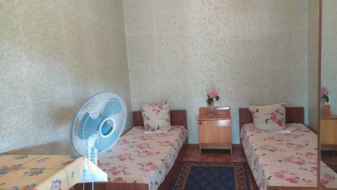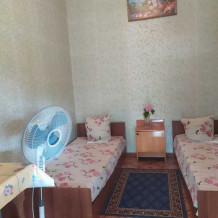 В номере три односпальные кровати, бра, зеркало, шкаф, тумба с телевизором, душ, умывальник, туалет. На балконе стол, стулья, холодильник. Вай-фай в номере. На первом этаже общая кухня. Во дворике: беседки с декоративными бассейнами, мангальная площадка. Парковка в наличии.