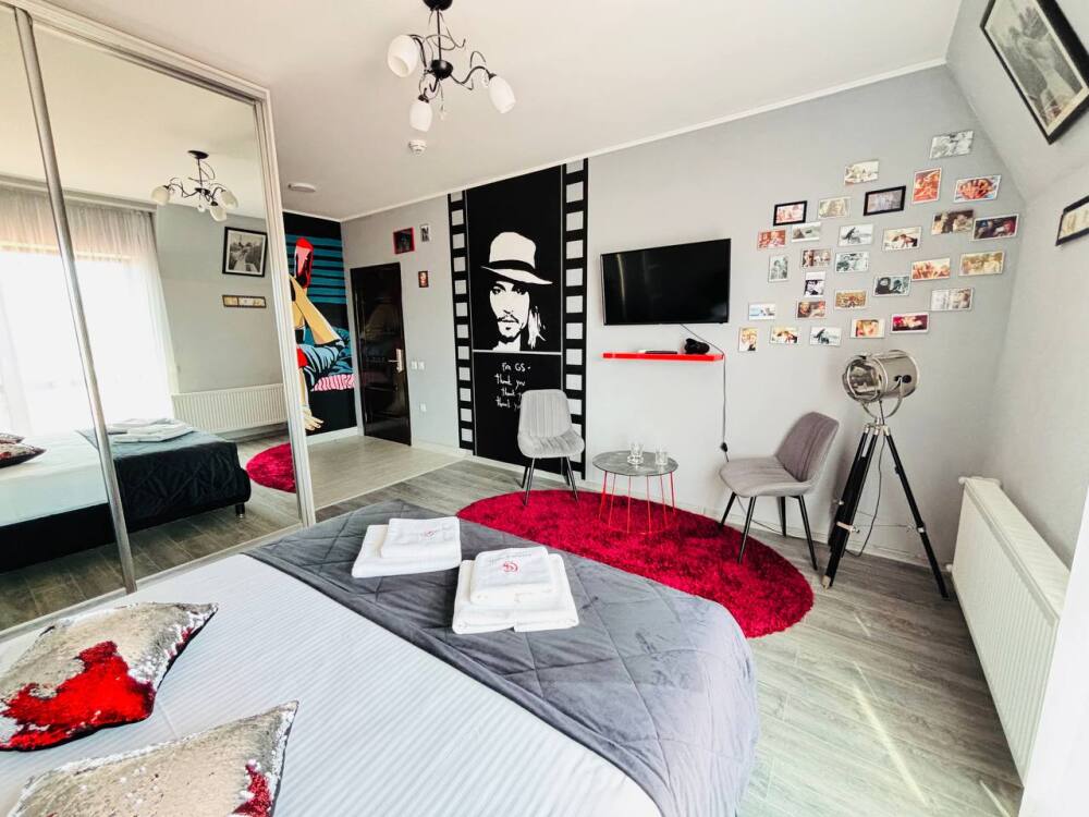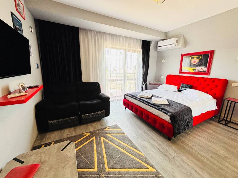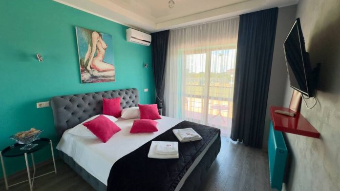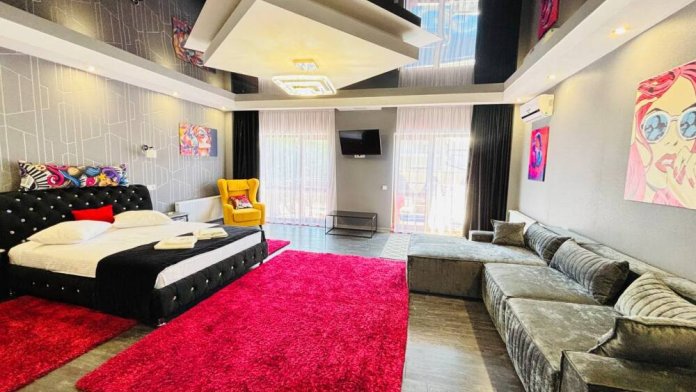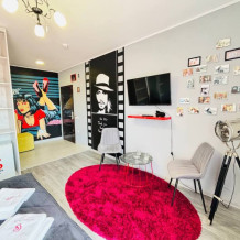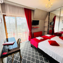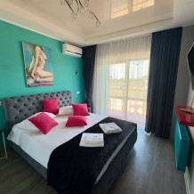 Каждый номер оформлен в своем стиле и тематике, с мастерски расставленными акцентами и вниманием к деталям. Насладитесь роскошью итальянской мягкой мебели, тишиной благодаря блэкаут шторам и мягкостью ковровых покрытий. Лоджия с прекрасным видом на Черное море оборудована удобной мебелью для вашего комфорта. Стены расписаны вручную профессиональными художниками, а тематические предметы интерьера завершают неповторимый образ каждого номера. Эта категория апартаментов идеально подойдет как для празднования особой даты, так и для незабываемого романтического уикенда.