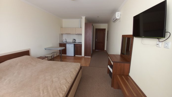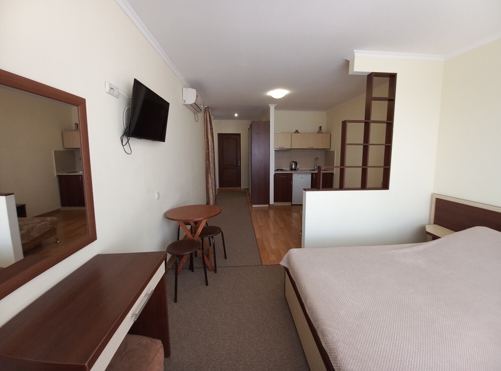 Санузел (унитаз, умывальник, душ). В номере имеется кондиционер, ж\к телевизор, обеденная зона (стол и три стула)