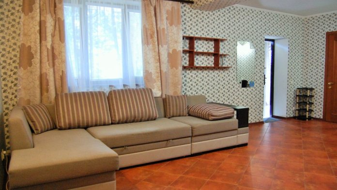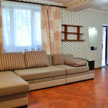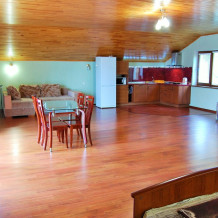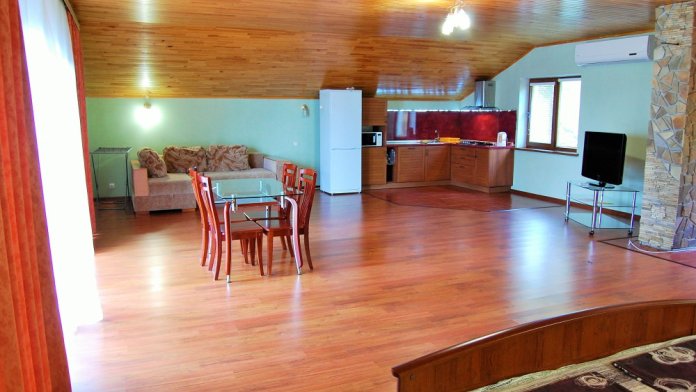Две просторные комнаты-спальни, кухня-столовая с полным набором посуды, балкон на весь этаж, кондиционер, камин. В каждой комнате телевизор. Своя отдельная большая беседка, мангал и двор.