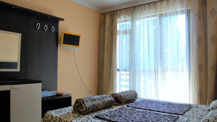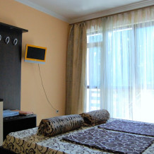 Просторный номер-студия с отличным видом на ливанские кедры, кипарисы и море. В номере большая двуспальная кровать с ортопедическим матрасом и двуспальный диван. Плазменный телевизор, мощный кондиционер. Номер разделен на три зоны: спальня, гостиная, кухня. Кухня оборудована всем необходимым: холодильник, микроволновка, чайник, газовая плита, весь набор нужной посуды. Душевая и туалет в номере, стиральная машина. Есть балкон. Своя беседка из деревянного сруба.