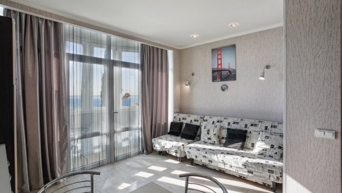 Три спальных места, раскладывающиеся диваны. Балкон с панорамным видом на море. На балконе уличная мебель. Зона кузни со всем необходимым: варочная поверхность, электрочайник, микроволновка. Посуда для принятия и приготовления пищи. В санузле стиральная машина, бойлер. В комнате телевизор, WI-FI. Полотенца, постель выдается. Есть фен, утюг, гладильная доска.