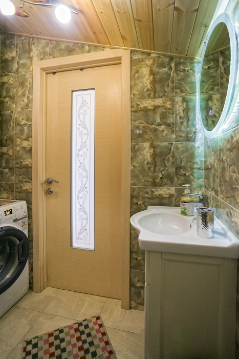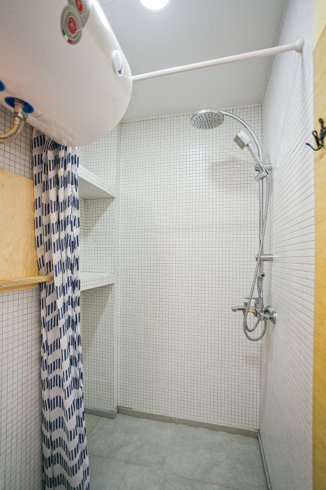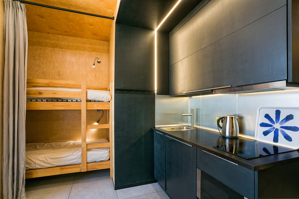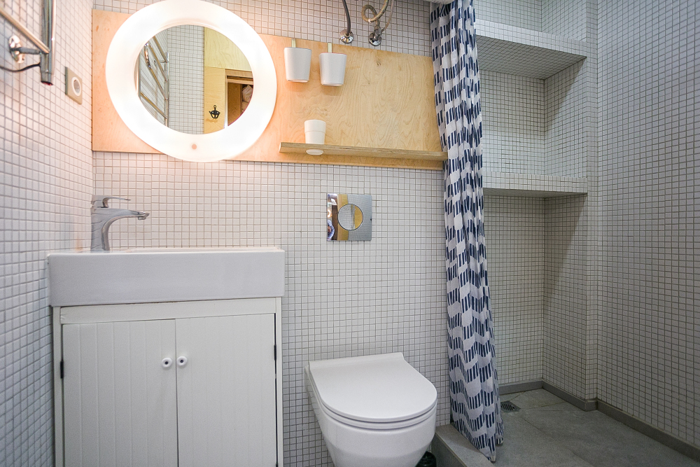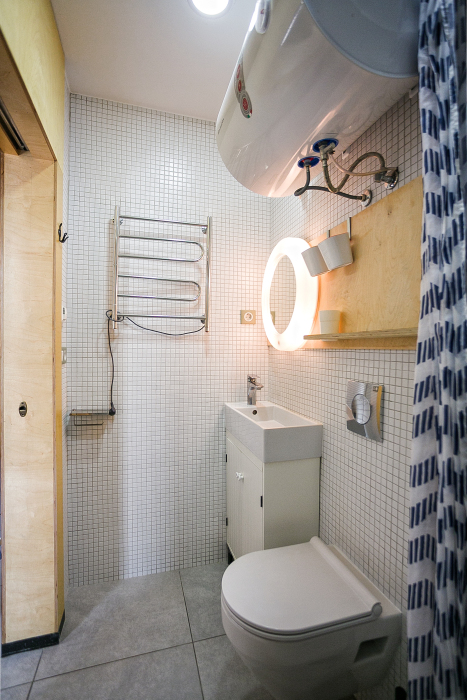 студя на троих человек. Находится на мансардном этаже. Зона кухни ,есть посуда для принятия и приготовления пищи. Санузел большой ,душевая кабина, есть стиральная машина.