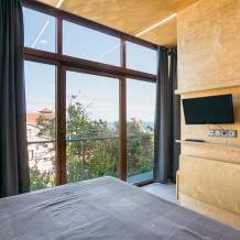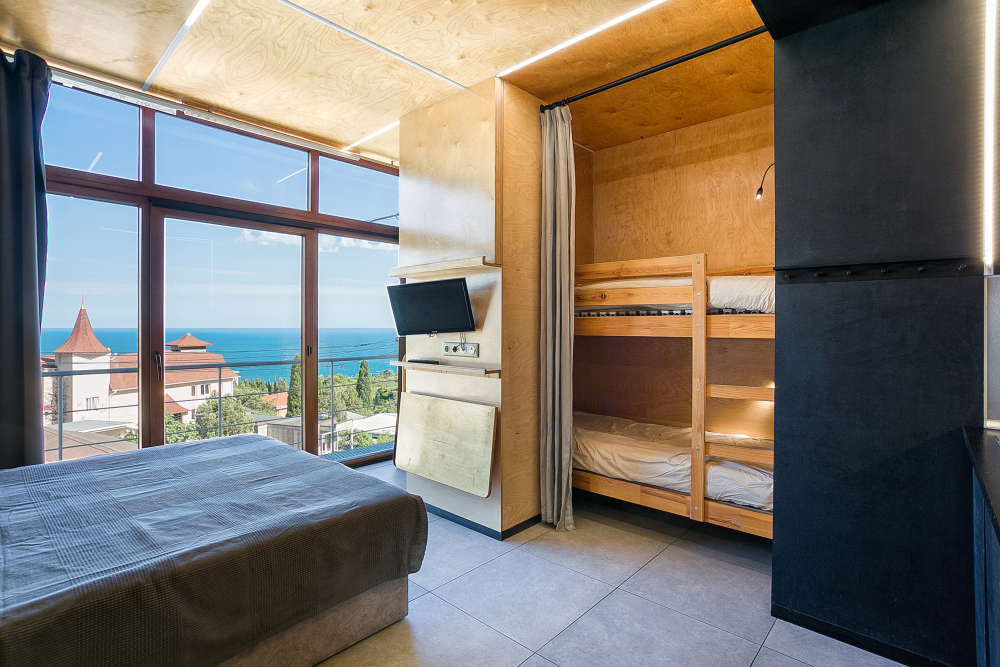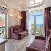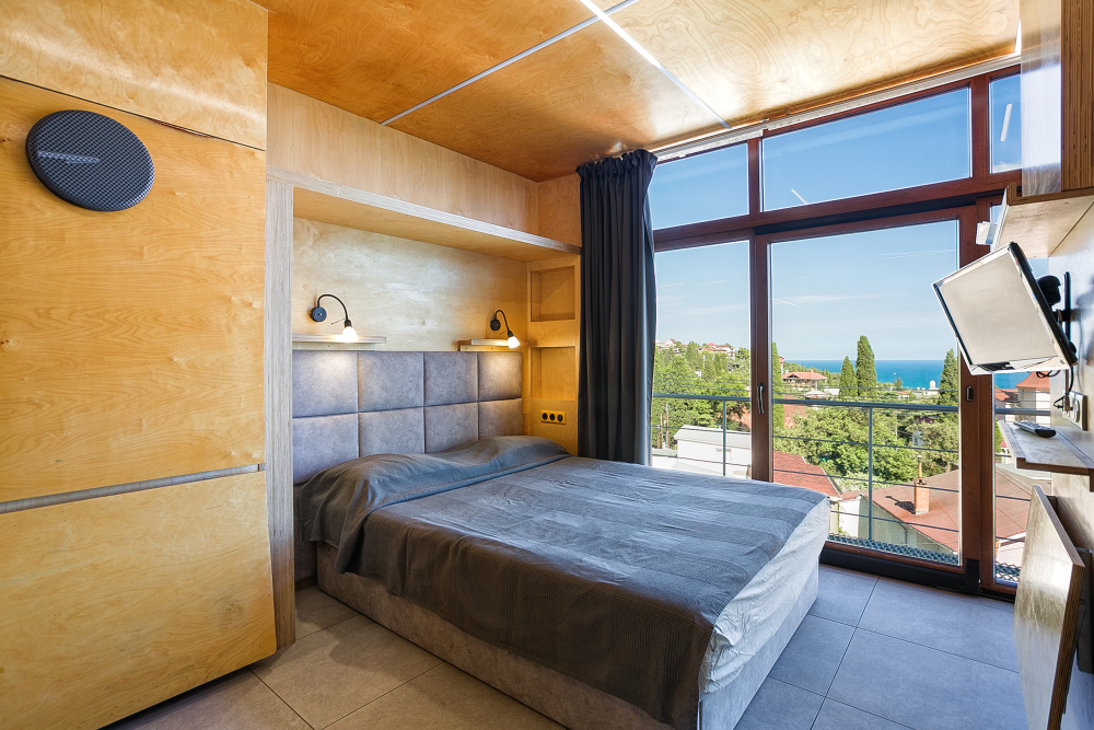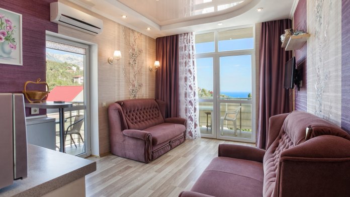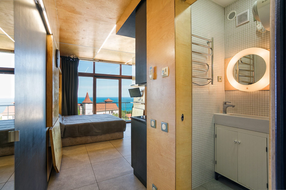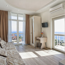 Прекрасный видовой экологически гипоаллергенный номер, рассчитан на 2-4 человека .Двухспальная кровать и двухярусная кровать. Есть зона кухни, можно готовить .Имеется посуда для принятия и приготовления пищи. Холодильник встроенный, микроволновка, электрический чайник, варочная поверхность, бойлер, кондиционер ,утюг, фен, теплый пол. Балкон, шикарный панорамный вид на море и горы. На балконе уличная мебель. Есть стиральная и посудомоечная машина