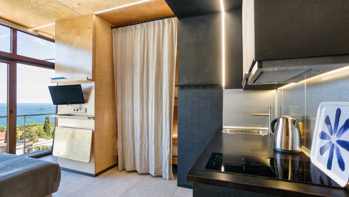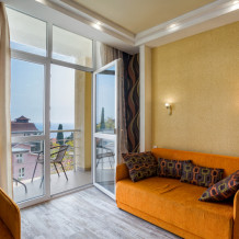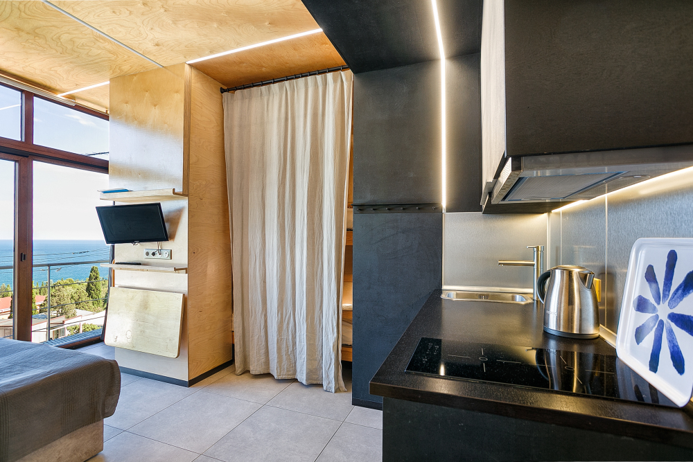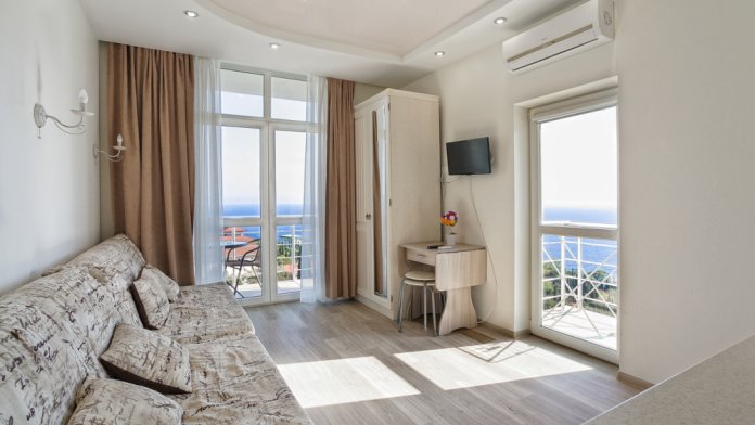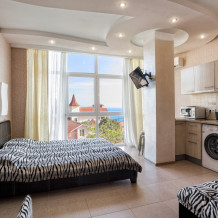 однокомнатная студия на 4-х человек.Большая двухспальная кровать и два раздельных кресла-кровати.Панорамные окна в пол.прекрасный вид на море и скалу Дива.Зона кухни,стиральная машина.