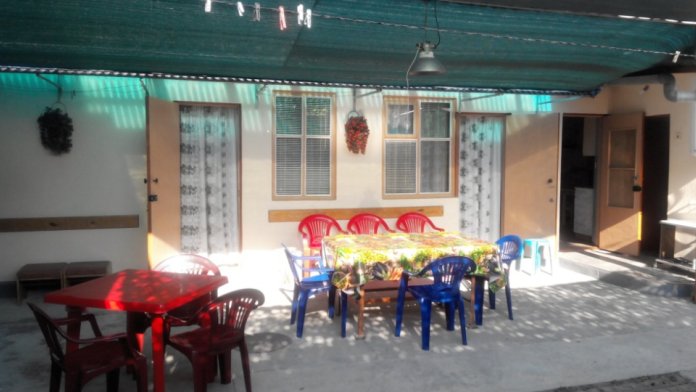 В доме есть большая общая кухня, для каждого номера отдельный стол с полным комплектом посуды, 4-х конфорочная газовая плита, два больших холодильника, кухонная мебель. Имеется мангал. Двор большой, чистый и уютный, затенен от солнца. Так же в доме два туалета и душ, содержатся в идеальном состоянии. Припарковать машину возможно.