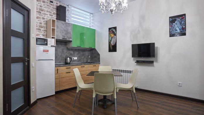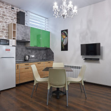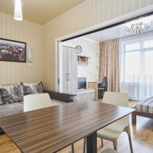 ждёт комфортабельная зона отдыха и полностью оборудованная кухня. Здесь вы найдете все необходимое для комфортного пребывания: зона для обеда, TV, холодильник, сплит-система, мини-парфюмерия.