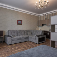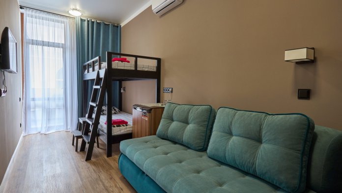 Апартамент станет оптимальным решением для размещения 2-х отдыхающих (просторная двуспальная кроват) и для 2-х гостей диван-кровать. Вас