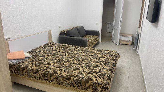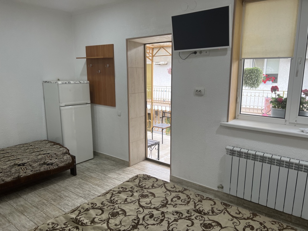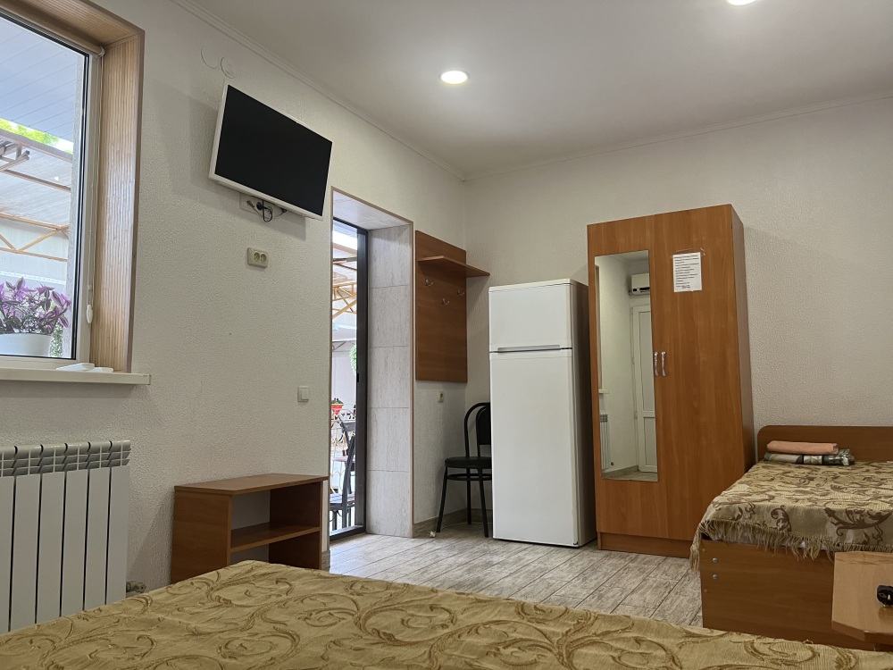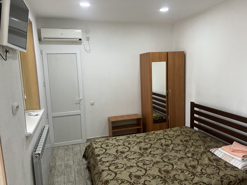 В доме все комнаты оборудованы: телевизором, холодильником, кондиционером, санузлом с холодной и горячей водой круглосуточно. В санузле – душевая кабинка, умывальник, зеркало, туалет. Также в комнате имеется - шкаф для одежды и вещей, полочка для обуви, вешалка, зеркало, прикроватные тумбочки. Комнаты рассчитаны на 2-5 человек. В комнатах чисто и уютно. Смена постельного белья, полотенец и уборка комнаты - бесплатно. Каждая комната с отдельным входом. Возле комнаты - кухня, на которой есть: плита, посуда, обеденный стол, стиральная машинка, гладильная доска и утюг.
