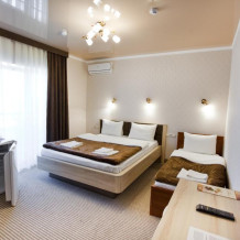 3-х местные номера (18 кв.м), в каждом из которых имеется холодильник, электрочайник, фен, два полотенца на каждого, кондиционер, спутниковое ТВ, Wi-Fi доступ в интернет , сейф, душ, умывальник, туалет.