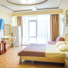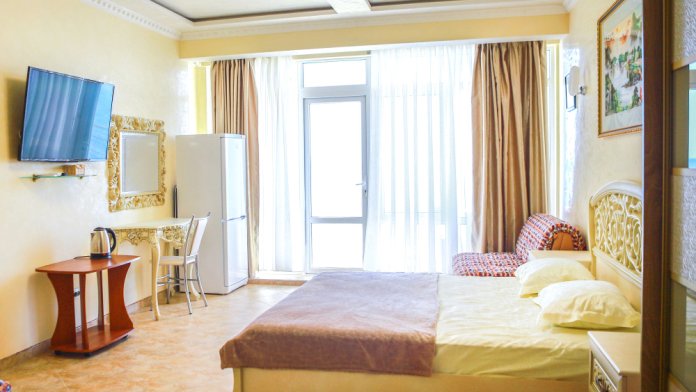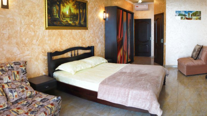 В номере кондиционер, большая двуспальная кровать, две раскладные кресло-кровати, большой холодильник, чайник, столовые приборы, шкаф для одежды, плазменный телевизор. Большой балкон со столом и стульями, а также шезлонгом с видом на море.
