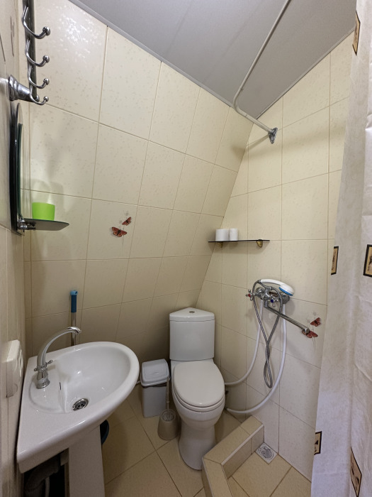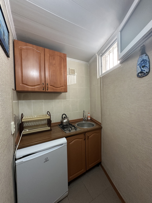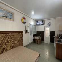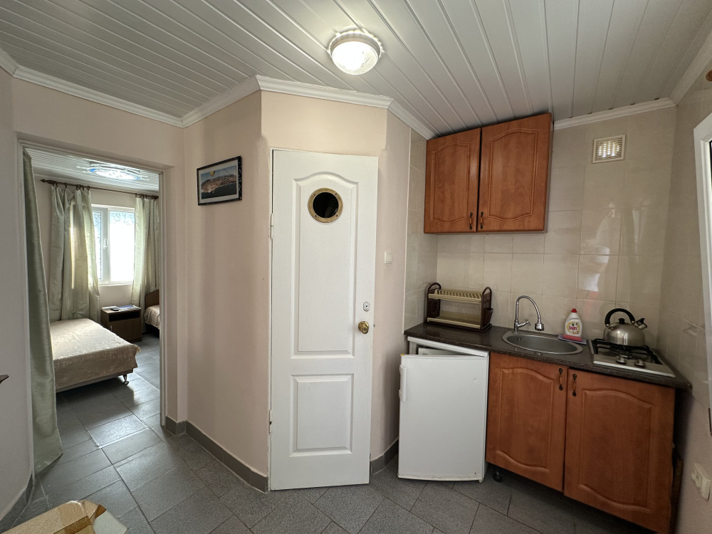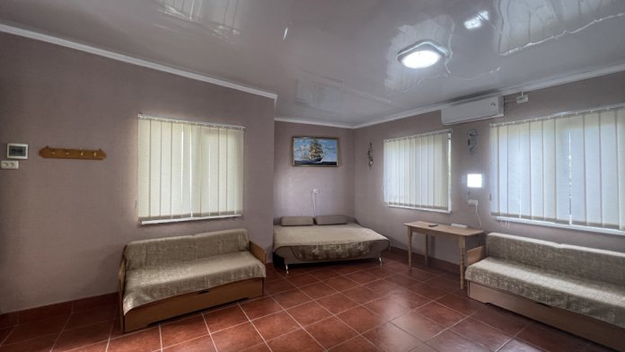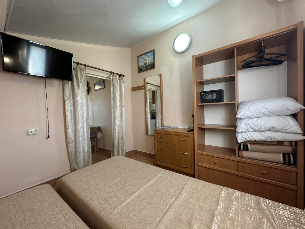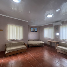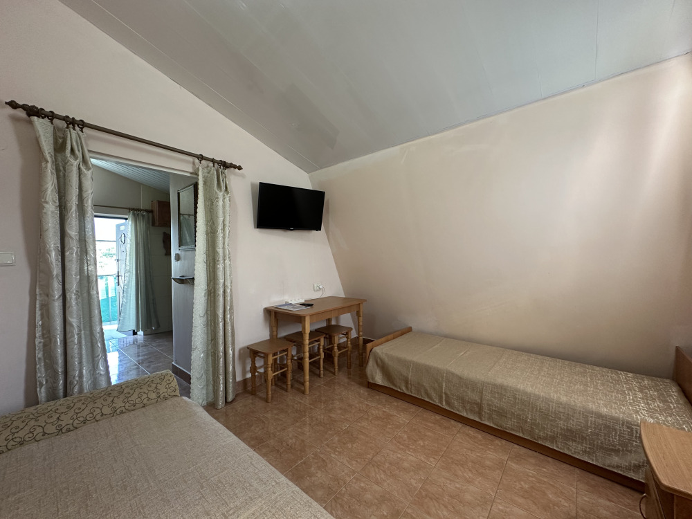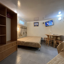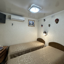 Четырехместный улучшенный номер находится на 2 этаже. В номере: санузел (душ, туалет, умывальник), оборудованная кухня (плита, чайник, необходимая посуда), холодильник, телевизор с кабельным ТВ, кондиционер, сейф, шкаф, спальная мебель. Вода холодная и горячая постоянно. В номере есть покрытие Wi-Fi сети.