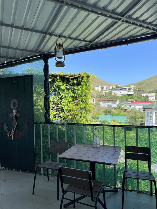 Вся территория дома утопает в зелени дикого винограда, которая обеспечивает благодатную прохладу даже в самые жаркие летние дни. Дом снаружи и его помещения декорированы морскими и пиратскими атрибутами, это придает ощущение, что Вы находитесь на пиратском корабле. В гостевом доме три этажа-палубы, номера расположены на всех трёх этажах. Так же есть мангальная зона, качели. и детская беседка. На верхней палубе находится смотровая площадка, с которой можно рассматривать морские пляжи в Двуякорной бухте. Оборудована большая беседка со столами, телевизором, что позволяет удобно и комфортно провести время или отпраздновать любое мероприятие.