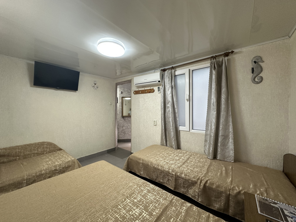 Четырехместные номера находятся на 1 и 2 этаже. В каждом номере: санузел (душ, туалет, умывальник), оборудованная кухня (плита, чайник, необходимая посуда), холодильник, телевизор с кабельным ТВ, кондиционер, сейф, шкаф, спальная мебель. Вода холодная и горячая постоянно. В номере есть покрытие Wi-Fi сети.