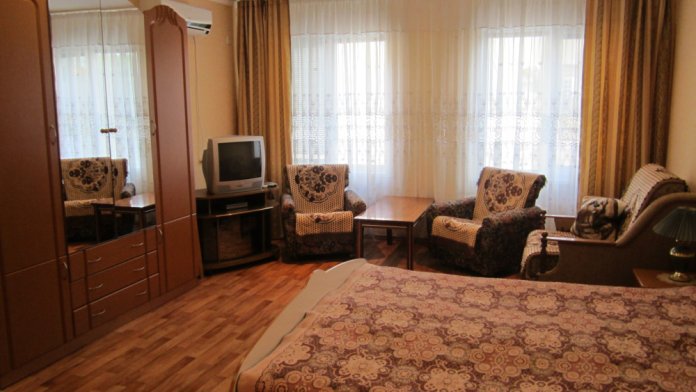 В номере в наличии уютная мебель, телевизор, WI-FI, кондиционер, кухня( оборудована всем необходимым для приготовления пищи), санузел с душевой кабинкой, вода горячая и холодная постоянно. Номер рассчитан на отдых для 3-4 человек.