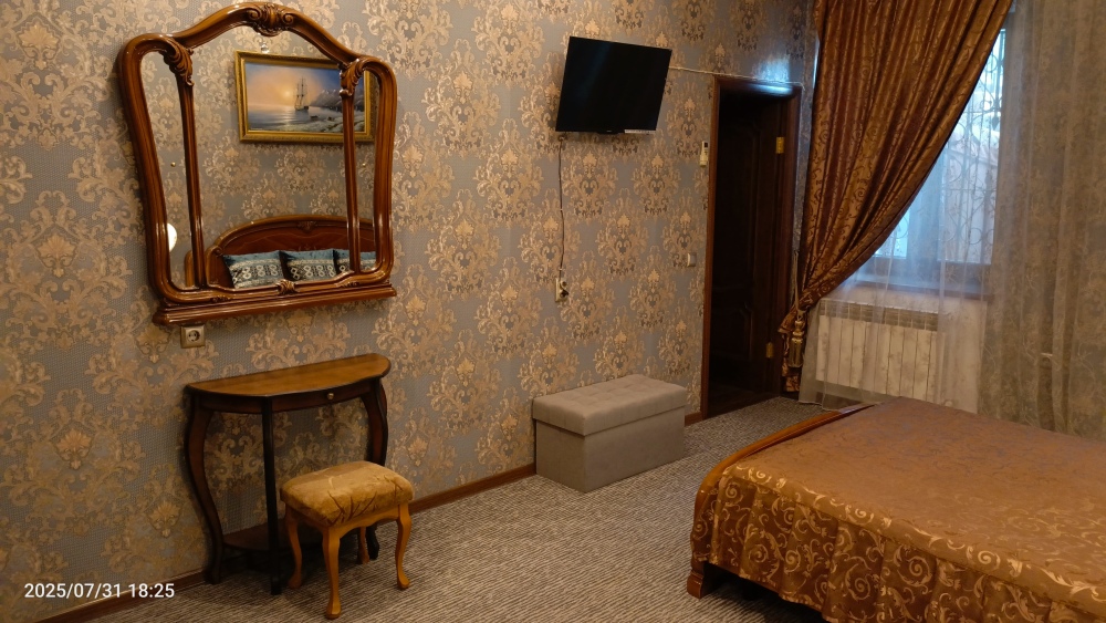 спальня- итальянская мебель: двуспальная кровать (200х160) , шкаф, тумбочки, плоский телевизор, кожаные кресла, гладильные принадлежности, большой кондиционер, Wi-Fi.