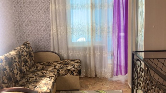 Одна просторная спальня позволят комфортно разместить 3 человека, прекрасный дизайн комнаты ,с перегородкой из портьер ,разделяет комнату на спальную зону и светлею зону с одним спальным местом .