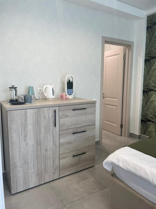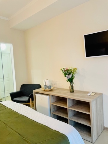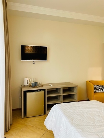 Элегантные номера оснащены кондиционером, телевизором с плоским экраном и спутниковыми каналами, холодильником, электрочайник, посудой (тарелки, ложки, вилки, стаканы, чашки). В каждом номере есть балкон. На балконе стол и стулья для отдыха. В номерах удобная современная мебель, ортопедические матрасы. Предоставляются постельные принадлежности, комплект полотенец.