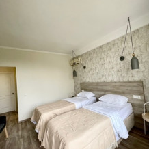 Номер с двумя кроватями, возможно одно дополнительное спальное место. Детям до 4-х лет - кроватка бесплатно. Просторная комната с удобным креслом, журнальным столиком и телевизором. Также в номере есть холодильник для хранения еды и стандартный набор посуды, электрочайник.