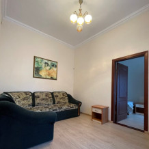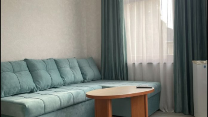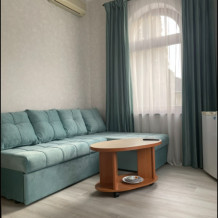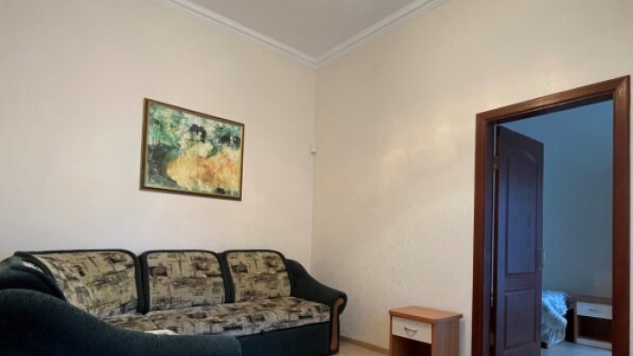 Двух комнатный номер на 1 этаже, имеет выход в собственный (только для этого номера) внутренний дворик, в номере две односпальные кровати, диван кровать, кресло столик, шкаф, тумбочки, стол, холодильник, чайник, ТВ, кондиционер