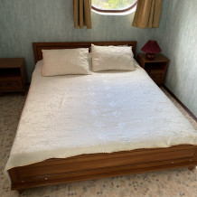 Двухкомнатный номер с большой террасой. В данном номере могут разместится свободно 5 человек. В первой комнате угловой диван, телевизор, кондиционер, шкаф, тумбочка, стол, балкон. В спальне установлена большая двухспальная кровать, тумбочки, шкаф, кондиционер, выход на террасу (20 метров с мебелью), в номере холодильник, чайник, сан.узел