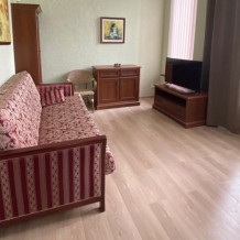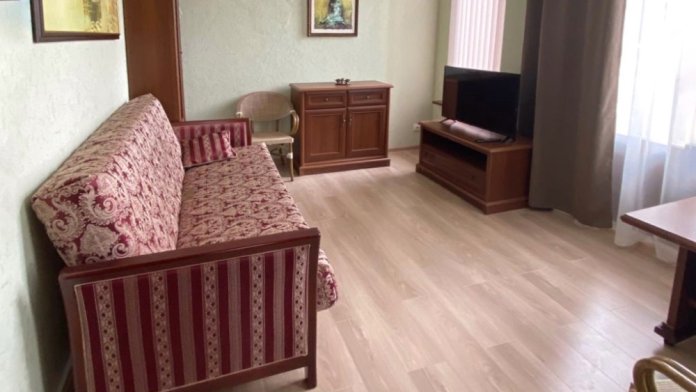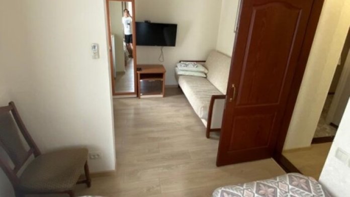 Номер на 1 этаже. В номере две односпальные кровати и диван-кровать, шкаф, тумбочки, столик, кондиционер, телевизор, холодильник, чайник, сан.узел