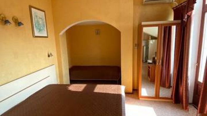 Полулюкс с балконом на 3 этаже, в номере могут разместится 4 человека (двухспальная кровать, односпальная кровать и софа), так же в номере есть шкаф, зеркало, столик, вешалка, тумбочки, холодильник, телевизор, кондиционер, чайник, сан.узел