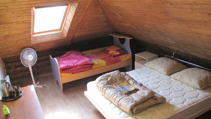 В уютном номере 2 большие двуспальные кровати, Wi-Fi и ТV. На этаже три номера.