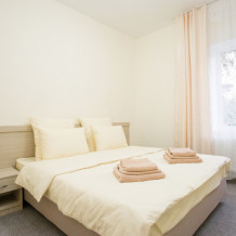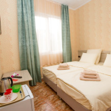 Однокомнатный номер с двумя односпальными или одной 2-спальной кроватью. На общей террасе стол, 2 стула, сушилка для белья.