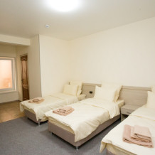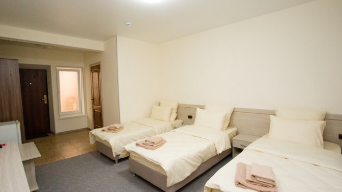 Однокомнатный номер с одной 2-спальной кроватью и односпальной кроватью, либо тремя односпальными кроватями. На общей террасе стол, 3 стула, сушилка для белья.