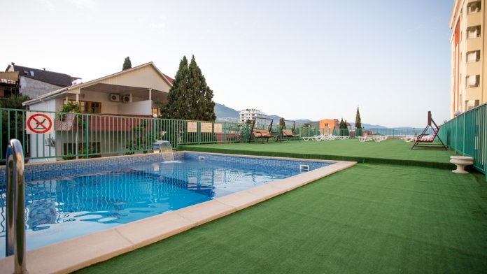 Открытый подогреваемый бассейн с террасой для приёма солнечных ванн, шезлонги и мягкие пуфы. WI-FI. Детская площадка.