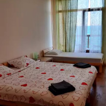 В номере двухспальная кровать и детская кровать. Холодильник на этаже.