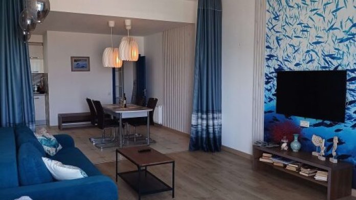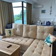 Оформлен в легком современном стиле. Очень уютный и светлый апартамент. Выходя на террасу, будто выходишь на палубу корабля, где то внизу море перешептывается с галькой, а легкий морской бриз развевает волосы. Светильник-чайки над диваном и макет корабля над огромным телевизором, только усиливают эффект ощущения морского круиза. Огромный диван, как кают-компания, а на современной и полностью оборудованной кухне, можно почувствовать себя настоящим коком.