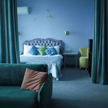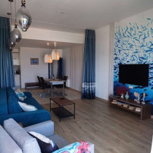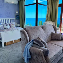 Оформлен во всех оттенках синего цвета. На стене рыбы, бра у кровати - медузы. Этот апартамент, как сказка о Русалочке. Очень уютный и комфортный. Из гостиной и спальни, через огромные панорамные окна-двери можно попасть на террасу - паттио, где стоит обеденный стол для семейной трапезы и качеля, на которой можно покачаться и помечтать о встречи с нашими черноморскими дельфинами - афалинами.