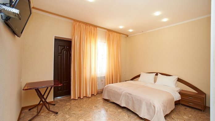 С каждого номера выход в общий уютный зеленый дворик. На балкончиках стоят столики со стульями для отдыха.