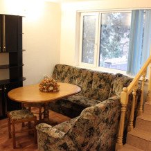 Мебель: 2 двуспальные кровати, 2 односпальных кровати, диван-кровать, кресла, стулья, шкаф, прикроватные тумбочки, стол, прихожая, вешалка, зеркало, кухонный гарнитур, обеденная зона.