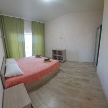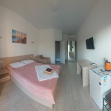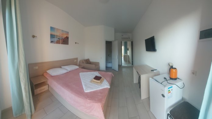 В номере: 1 двухспальная кровать, кресло-кровать и возможностью еще одного доп. места в виде раскладушки. В номере есть кондиционер, холодильник, фен, телевизор, эл.чайник. В кухне общего пользования для каждого номера есть свои шкафы и индивидуальный набор посуды для приготовления пищи. Горячая вода постоянно. Стиральная машинка и гладильная доска в общем доступе.