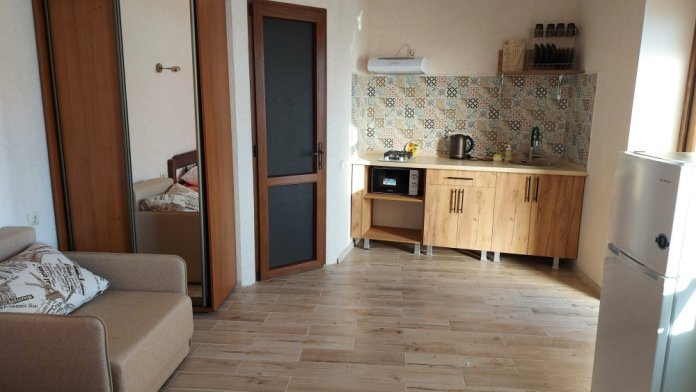 Коттедж однокомнатный с кухней. Есть всё необходимое для хорошего отдыха. Телевизор , кондиционер, СВЧ, газовая плита,холодильник,весь набор посуды. Во дворе есть детская площадка, мангальная зона.
