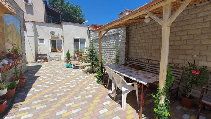 Во дворе проживает сама хозяйка и сдаются два дома (включая этот), второй дом - двухкомнатный. У данного дома есть личная зона отдыха в виде террасы при выходе из дома. Авто можно поставить перед входом во двор (у хозяйки есть пульт от шлагбаума, она его выдает, поэтому место для авто всегда будет). В доме все удобства, 2 кондиционера, 2 спальни, зал, просторная кухня. Перед домом имеется своя беседка. Во дворе имеется мангал и шезлонги.