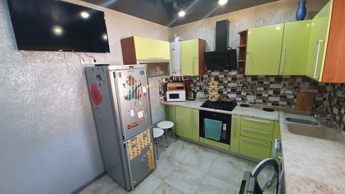 Трехкомнатный апартамент с изолированными комнатами и хорошим ремонтом. В апартаменте 4 телевизора: в каждой комнате и на кухне. Кондиционера в номере два. Из бытовой техники есть: микроволновая печь, духовка, посудомоечная машина; стиральная машина. Есть отдельная терраса.
