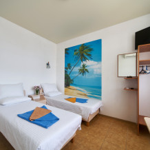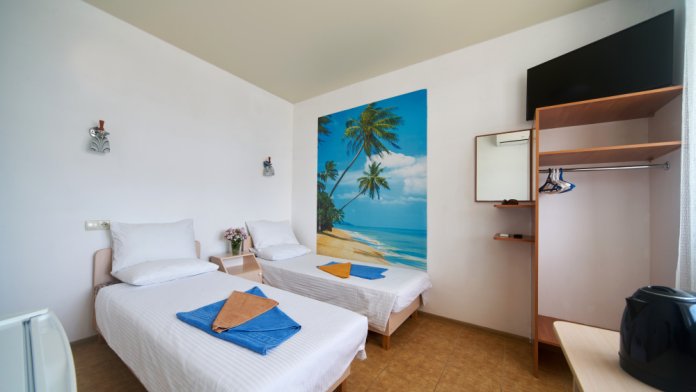 Номер оборудован мебелью и техникой для комфортного проживания: двуспальная или 2 односпальные кровати, прикроватные тумбочки, шкаф, зеркало, кондиционер, холодильник, телевизор, чайник. Фен, утюг и микроволновая печь имеются на этаже.