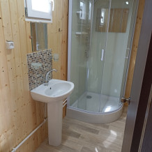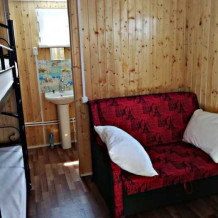 Новая кухня оборудована всем необходимым для самостоятельного приготовления. Небольшие домики, но оборудованы всем необходимым. Душ, туалет, умывальник, холодильник, телевизор, кондиционер, WI-FI. Новые домики свежей постройки 2021 года. Всё новое оборудование. Мангал на территории.