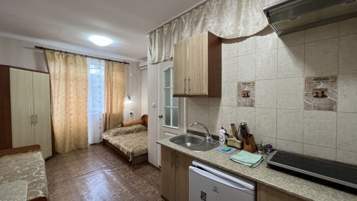 Сдается уютная однокомнатная студия со всеми удобствами, который расположен рядом с парком в центре поселка. Площадь студии – 19 кв. м. Расположиться в студии может до 3х человек. В однокомнатной студии 2-х спальный и односпальный диваны, санузел, кухня, кондиционер, телевизор, шкаф. Рядом с домом: магазины, парк, детская площадка.