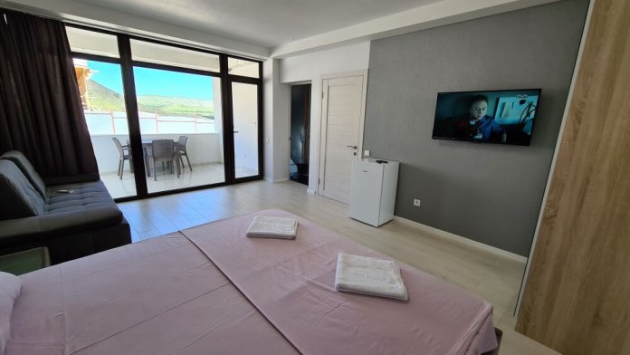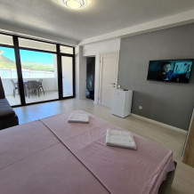 Мы предлагаем для Вас семейные номера со всеми удобствами, большой террасой и своей мини-кухней. В комнате стоит большая кровать «king size» 180х200 и раскладной диван 140х200.