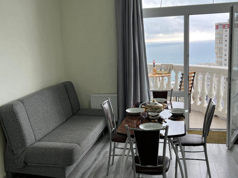 Видовая двухкомнатная квартира с двумя балконами. Квартира очень светлая, с потрясающим видом на море и горы.Общая площадь 31.2 м2. Отдельная спальная комната с двумя кроватями( 1.60 и 90) и кухня- гостинная с раскладным диваном.Встроенная кухня с плитой и необходимым столовым инвентарем, бытовой техникой. Бесплатная парковка и подогреваемые бассейны бесплатно!