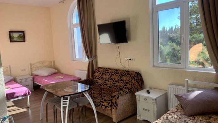 Апартаменты гостевого дома расположены на 3 этажах, каждые оснащены встроенной новой кухней и бытовой техникой, центральные коммуникации. На крыше здания расположена общая зона отдыха со всей необходимой мебелью, с которой открывается потрясающий панорамный вид на море и гору Ай Петри.