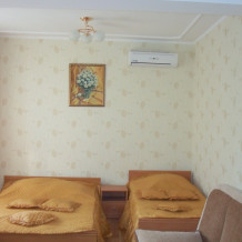 В нашем гостевом доме три комфортабельных номера, каждый имеет отдельный вход, в каждом новая мебель, кондиционер, кухня с полным набором всей необходимой посуды для приготовления пищи, газовая плита, микроволновая печь, душ, санузел, стиральная машина, WI-FI, балкон со столиками. С балкона открывается вид на море.