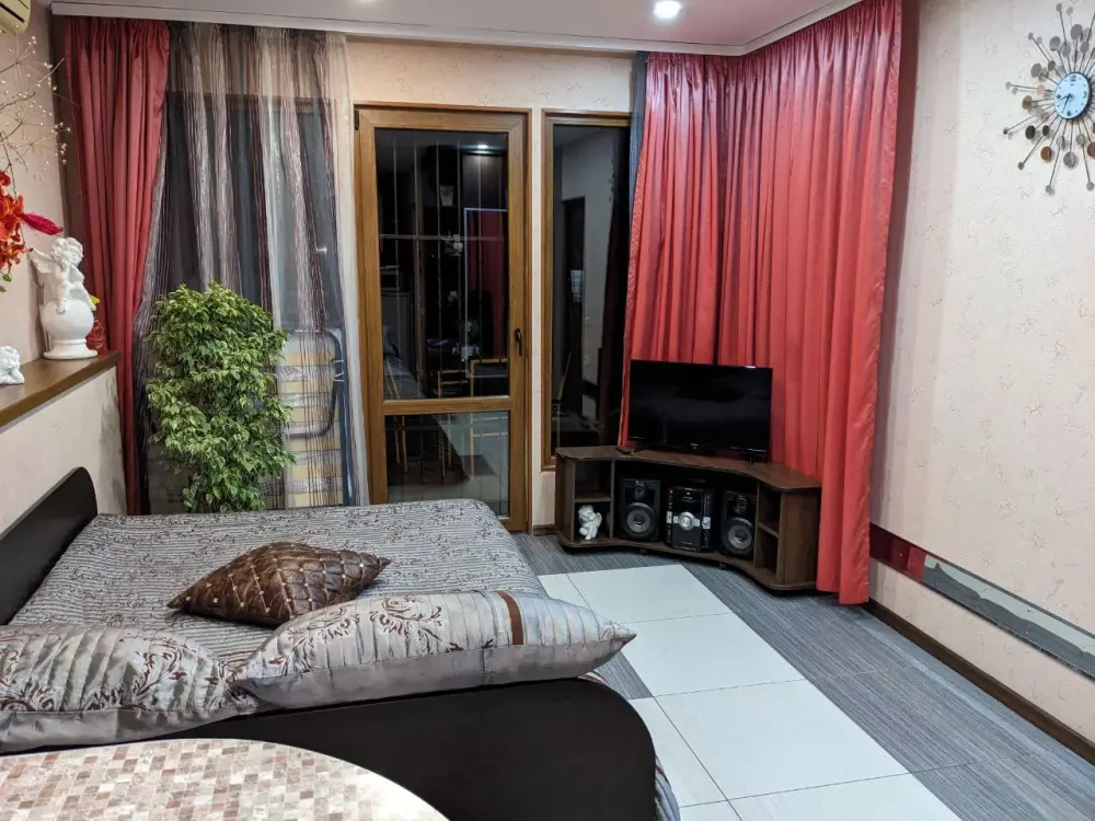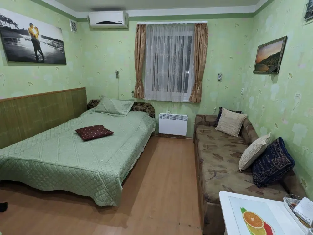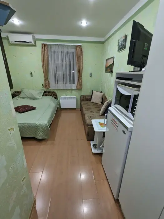Достаточно чистый номер. Есть все необходимое. Сдали номер на два часа раньше. Оставили сумки, ушли по делам перед отъездом. Промокли и замерзли, за теплыми вещами не стали возвращаться, чтобы лишний раз не беспокоить хозяина Владислава. Промокли и замерзали. Пришли забрать сумку, попросились сходить в туалет. На что Владислав промолчал. Оставил нас стоять под дождем. Даже подросток был очень огорчен таким поступком. Ждали такси под дождем. Данная ситуация подпортила впечатление от отдыха в Ялте в целом.